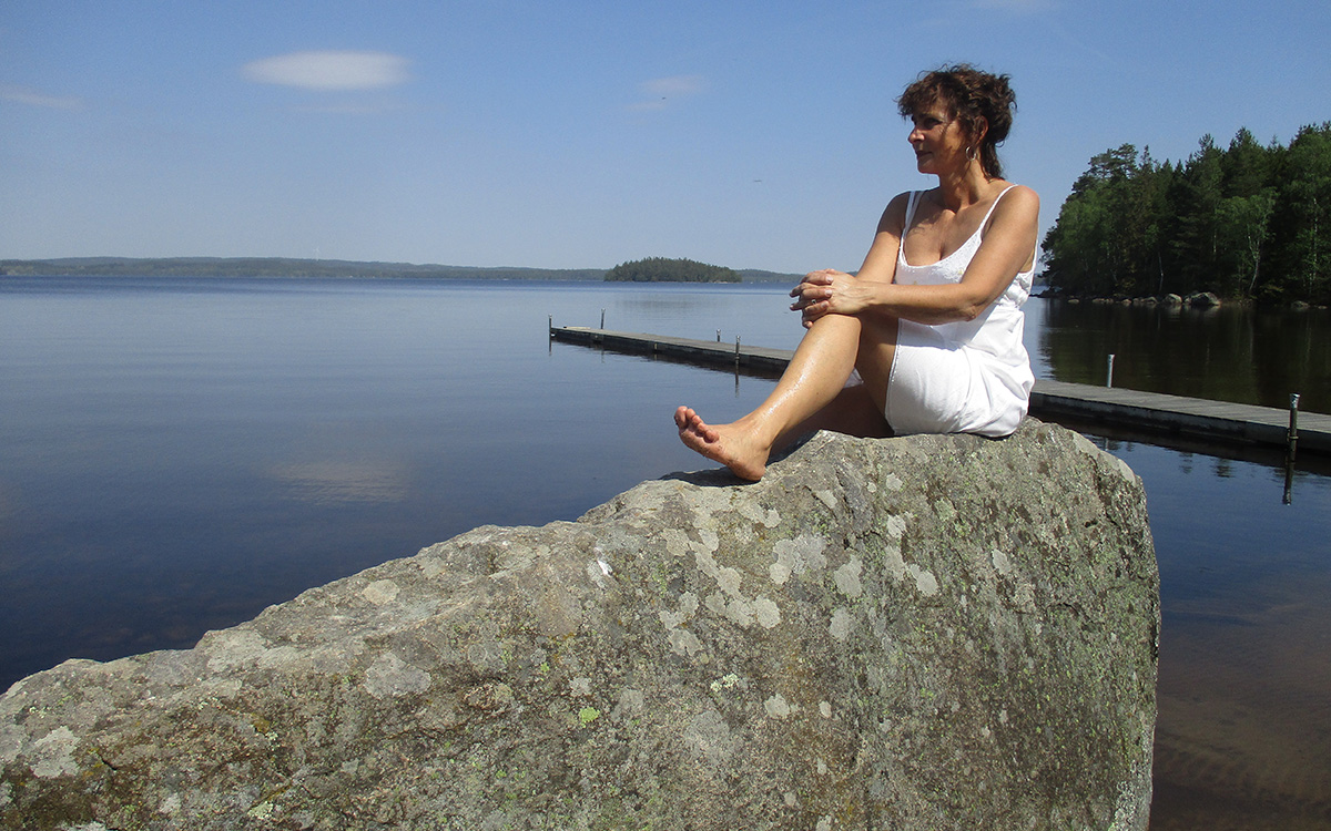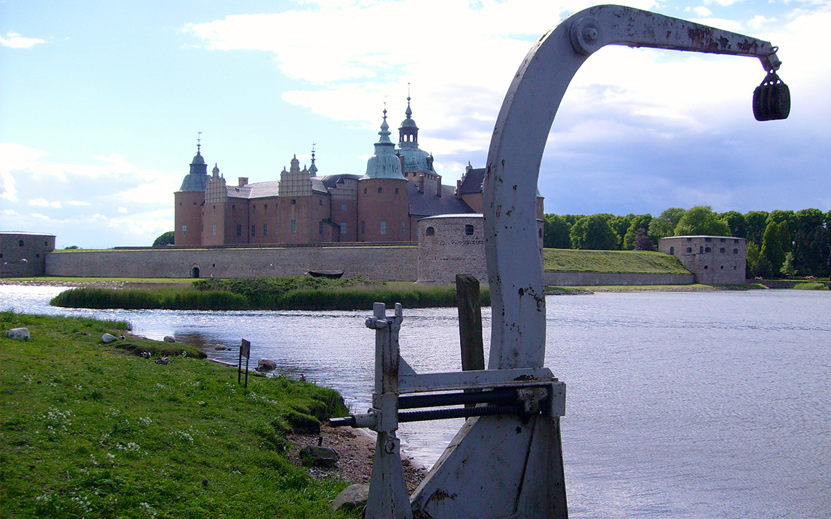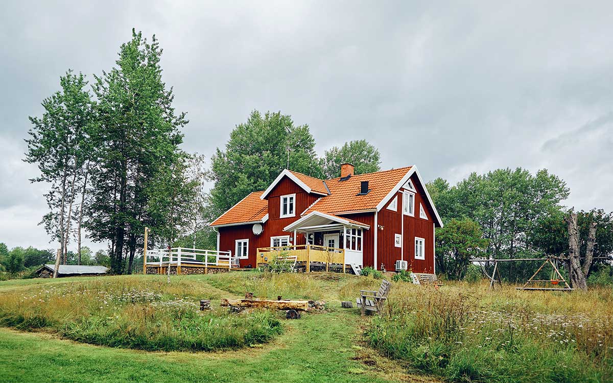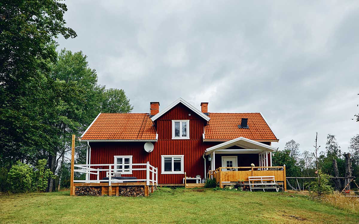 Småland's scenic backdrop consists of red wooden cottages, green forests, glistening lakes and jetty seas under a clear blue sky.